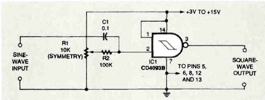 Encontramos este circuito en un artículo de la revista Electronics Now de marzo de 1996. La frecuencia está limitada a unos pocos megahercios y la fuente de alimentación debe estar dentro del rango indicado, lo que también determinará la tensión pico de la señal de entrada.