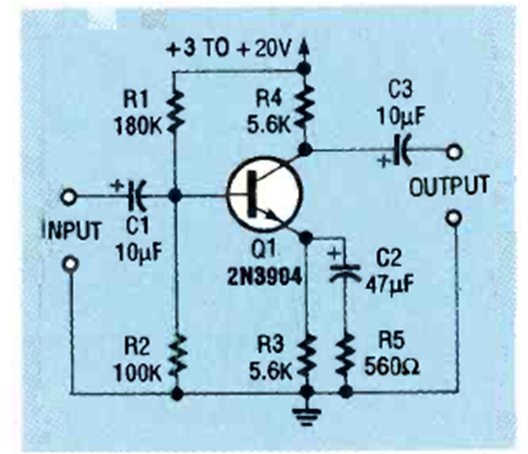 Utilizando un transistor de propósito general, esta etapa tiene una ganancia de voltaje igual a 10. El circuito se obtuvo de la revista Electronics Now de noviembre de 1993.