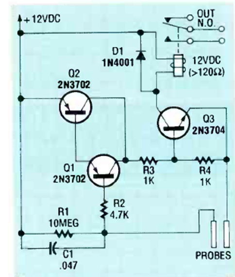 Este circuito sensible con 3 transistores fue encontrado en la revista Radio Electronics de julio de 1990. La alimentación depende de la tensión del relé utilizado.