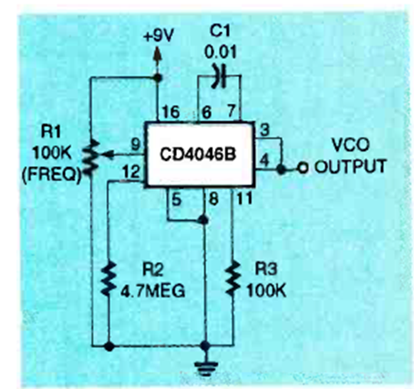 Encontramos este circuito en la edición de agosto de 1994 de la revista Electronics Now. El 4046 es poco común hoy en día. El circuito funciona desde 60 Hz hasta 1,4 kHz.