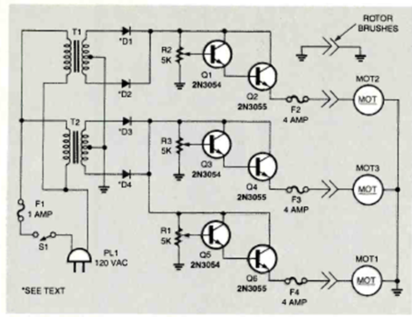 Este circuito experimental de drones fue publicado en un artículo de la revista Radio Electronics en diciembre de 1987. El pequeño vehículo se cierne sobre una mesa u otro lugar mientras es controlado a través de cables en un sistema de hélice de 3 ejes.