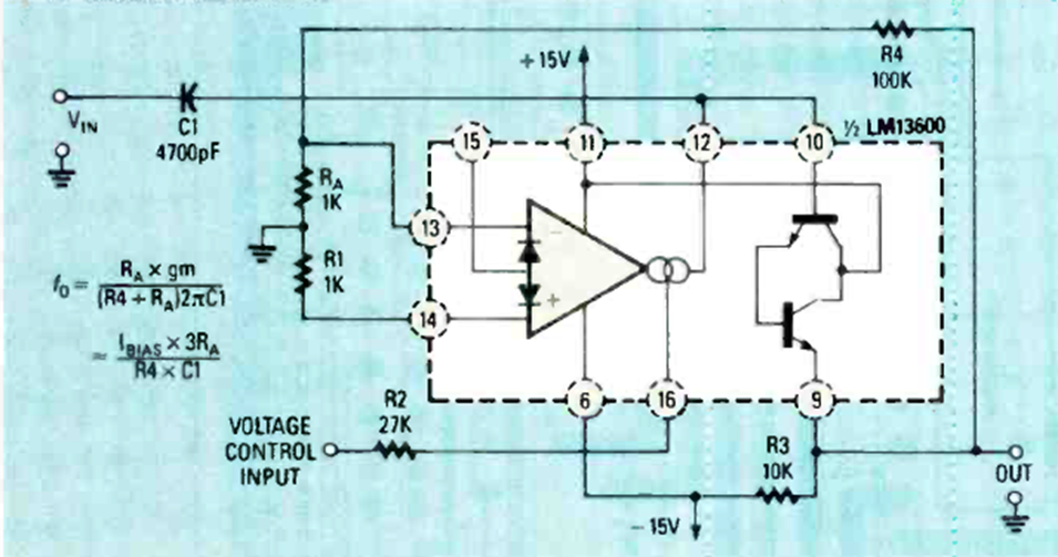 Este circuito, basado en un amplificador operacional OTA LM3600, fue encontrado en la revista Radio Electronics de julio de 1988. El rango es de 6 Hz a 6 kHz y puede modificarse.