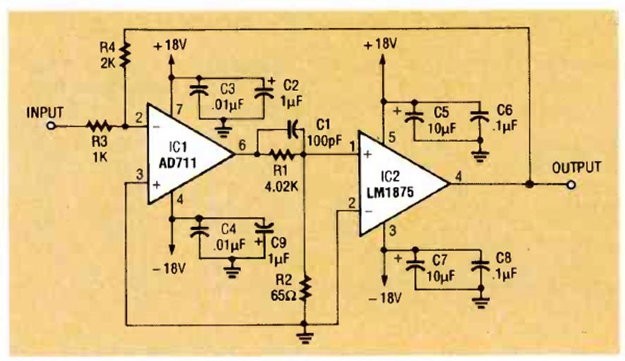 Encontramos este circuito en la edición de noviembre de 1992 de la revista Radio Electronics. El circuito consta de dos circuitos integrados, uno de los cuales es una etapa de preamplificación. La fuente debe ser simétrica.