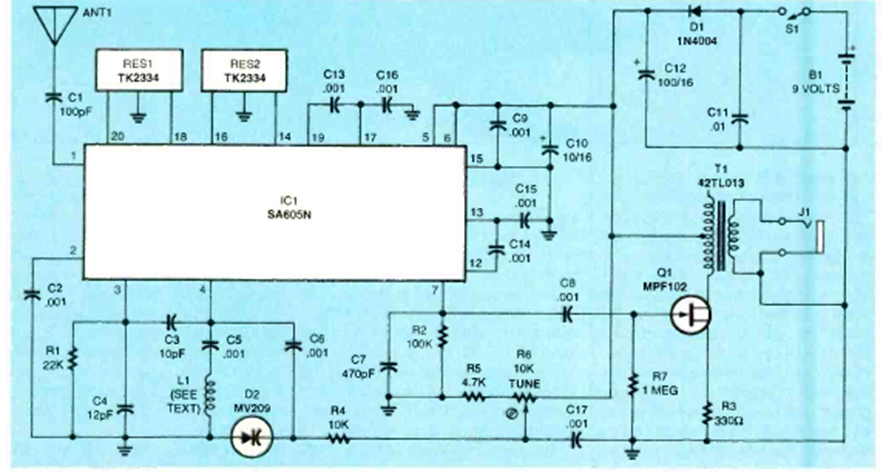 Este circuito fue encontrado en la edición de enero de 1999 de la revista Electronics Now. El circuito utiliza un circuito integrado de la época y tiene escucha con auriculares.
