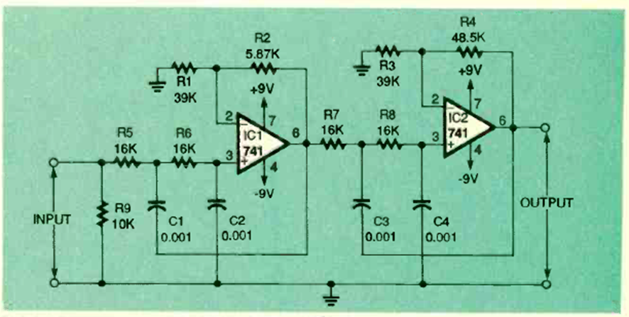 Este filtro de 10 kHz se obtuvo de un artículo de la revista Electronics Now en febrero de 1995. La fuente de alimentación es simétrica y se pueden utilizar otros operacionales equivalentes.