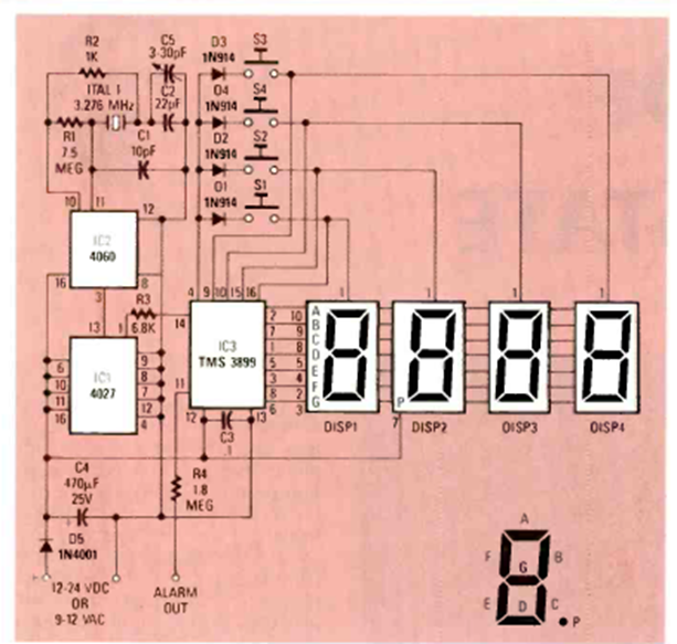 Como referencia para restauradores, este es el circuito de un reloj digital con el módulo TSM201. El circuito fue publicado en la edición de noviembre de 1987 de la revista Radio Electronics.