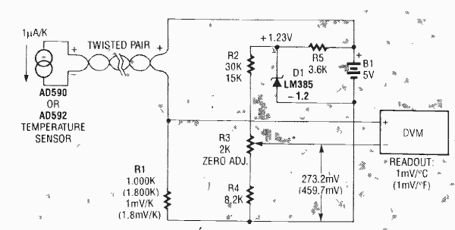 Este circuito permite leer temperaturas con un voltímetro digital común. Lo encontramos en la revista Radio Electronics de marzo de 1992. El circuito genera 1 mV por cada grado Celsius o Fahrenheit con los valores de los componentes entre paréntesis.