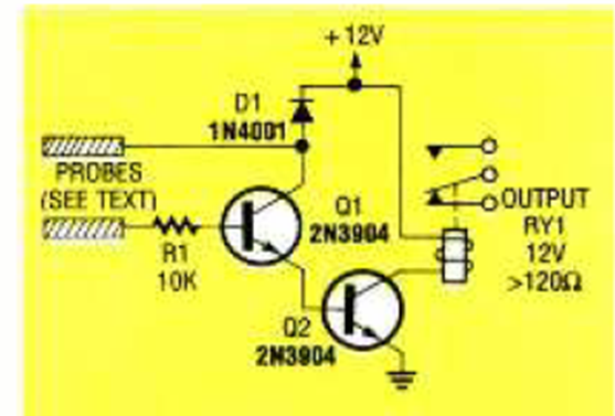 Este circuito activa un relé cuando una persona sostiene las sondas. El circuito es de Electronics Now y el voltaje de suministro depende del relé.