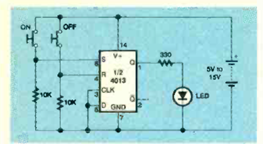 Este circuito sirve como demostración didáctica de cómo funciona un biestable o flip-flop. El circuito es de la revista Electronics Now, marzo de 1996. Se puede utilizar un relé en lugar del LED.