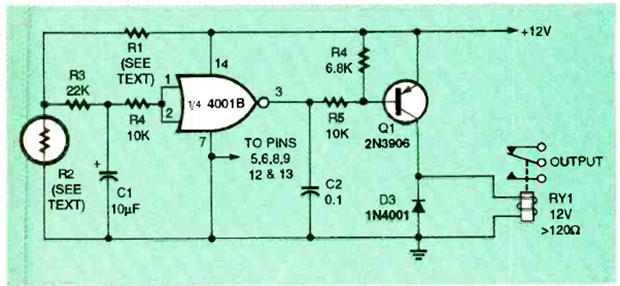 Este circuito sensible fue encontrado en la revista Electronics Now de junio de 1995. R1 puede ser de 10k a 1M dependiendo de la sensibilidad deseada. La alimentación se realiza mediante relé.