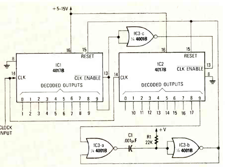 En la figura tenemos la forma de dividir la frecuencia de una señal por 17 utilizando el 4017. Se requieren circuitos CMOS adicionales.