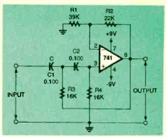 Este filtro con el amplificador operacional 741 se encontró en la revista Electronics Now de febrero de 1995. La fuente de alimentación debe ser simétrica.