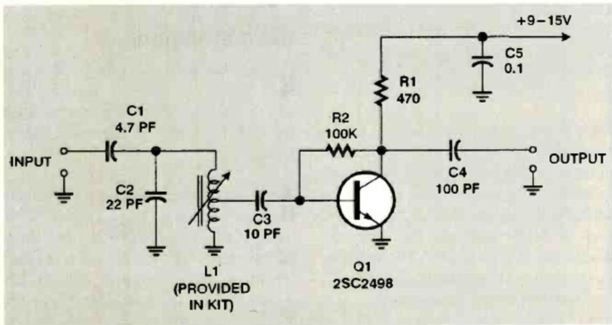 Encontramos este circuito en la edición de diciembre de 1998 de la revista Electronics Now. Se pueden utilizar transistores de RF como el BF494 o BF495. El circuito funciona a frecuencias más bajas.