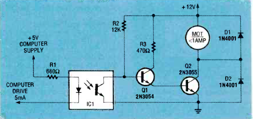 Este circuito es de una marca Radio Electronics de agosto de 1992. El transistor utilizado permite el control de motores de hasta unos 5 A. Debe estar equipado con un disipador de calor.