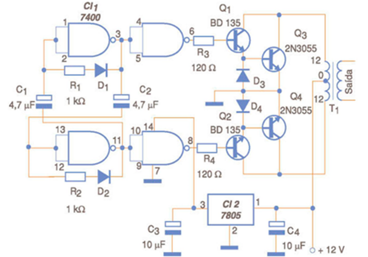 El circuito inversor mostrado en la figura proporciona una tensión de alrededor de 110 V con una forma de onda rectangular con una ligera distorsión que, en cierto modo, la acerca a una forma sinusoidal y una frecuencia de alrededor de 60 Hz. La potencia ronda los 20 W, dependiendo de la eficiencia del transformador utilizado, lo que hace que el circuito sea interesante para alimentar dispositivos que no son sensibles a la forma de onda de entrada, como afeitadoras, lámparas incandescentes, etc. Los transistores de potencia deben estar equipados con disipadores de calor. El transformador tiene un secundario de 12 V + 12 V con una corriente de 3 A. Se pueden utilizar transformadores con corrientes menores, pero también tendremos una potencia de salida menor. El circuito integrado del oscilador TTL debe ser alimentado con 5 V, voltaje que es proporcionado por un regulador 7805. Dado que solo se alimenta un IC, no será necesario utilizar un disipador de calor en el regulador. Los senderos recorridos por las corrientes más fuertes deben ser más anchos. Los transistores de potencia 2N3055 deben montarse sobre buenos disipadores de calor, preferiblemente en el exterior de la caja que albergará el conjunto.