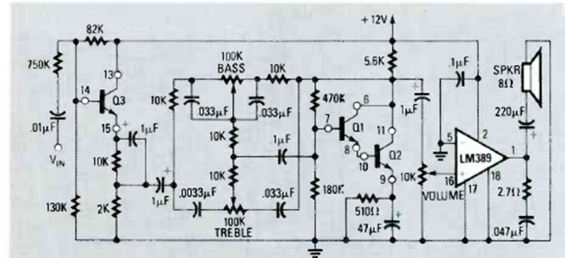 Este circuito de bajo consumo fue descubierto en la edición de marzo de 1990 de la revista Radio Electronics. Consiste en una solución de control de tono para tocadiscos portátiles.