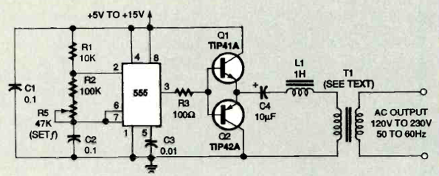 Este circuito con unos pocos vatios de potencia fue encontrado en la edición de abril de 1995 de la revista Electronics Now. La tensión obtenida y la eficiencia dependen en gran medida del transformador utilizado.