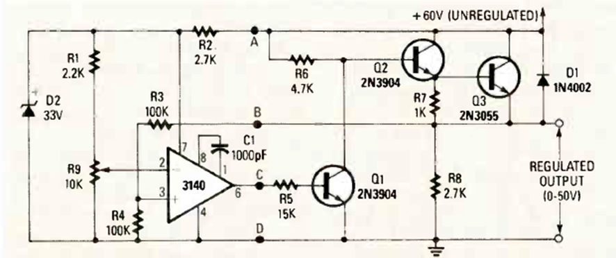 Este circuito regulador de voltaje variable tiene una etapa de potencia capaz de entregar corrientes de hasta 1A. El transistor de potencia debe estar equipado con un disipador de calor.
