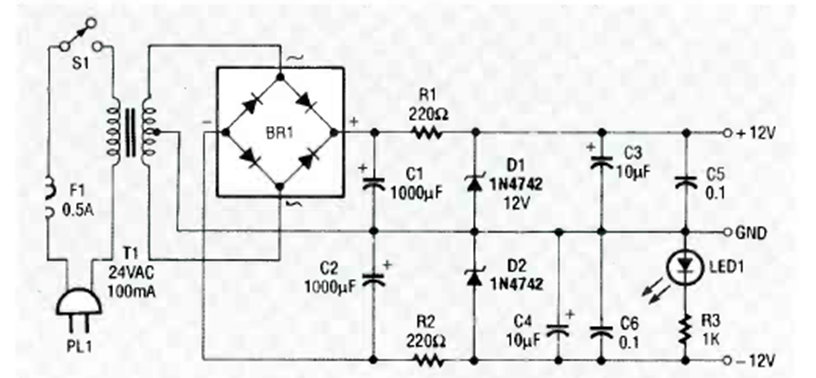Este circuito con corriente hasta 100 mA según el transformador fue encontrado en la revista Radio Electronics de octubre de 1991. La regulación se realiza directamente mediante los zener.
