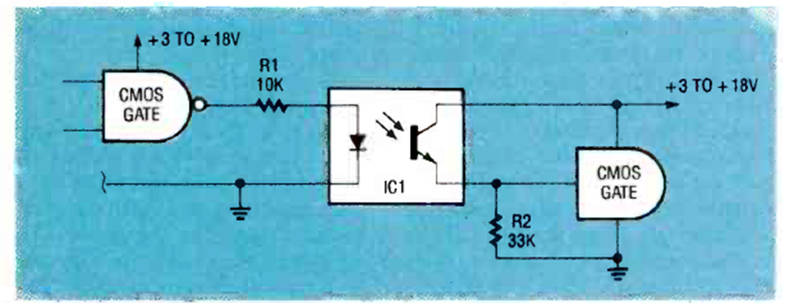 En la figura mostramos cómo acoplar dos circuitos CMOS utilizando un acoplador óptico para lograr el aislamiento. El circuito es de una Radio Electronics de agosto de 1992.