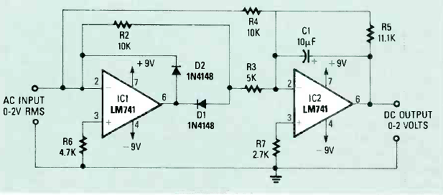 Este circuito con dos operadores fue encontrado en la revista Radio Electronics de septiembre de 1989. Se pueden utilizar otros operacionales. La fuente debe ser simétrica.