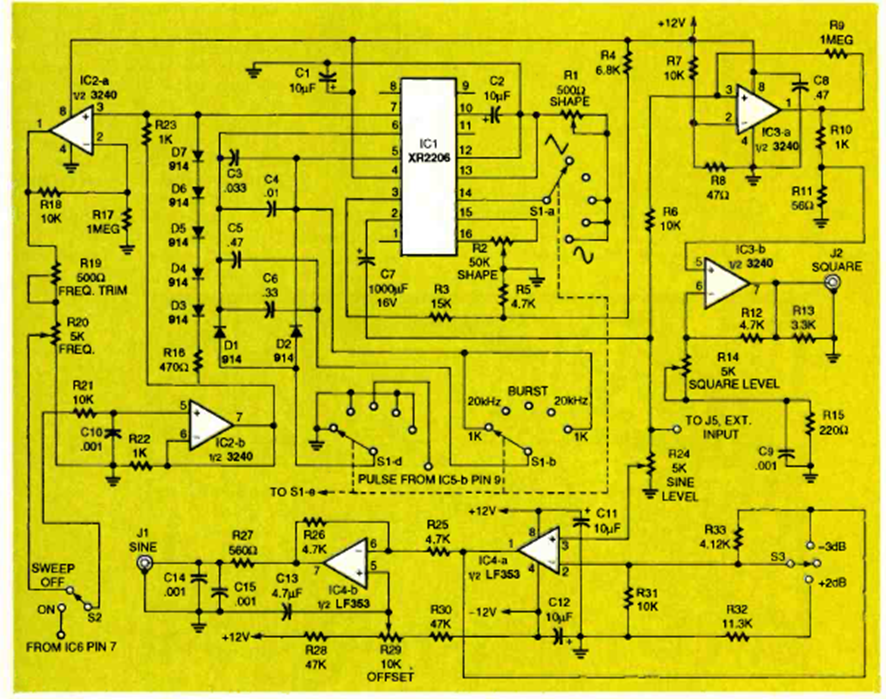 Este circuito generador de funciones de 5 bandas se encontró en la edición de abril de 1994 de la revista Electronics Now. El circuito tiene tres formas de onda posibles y emplea operacionales adicionales.
