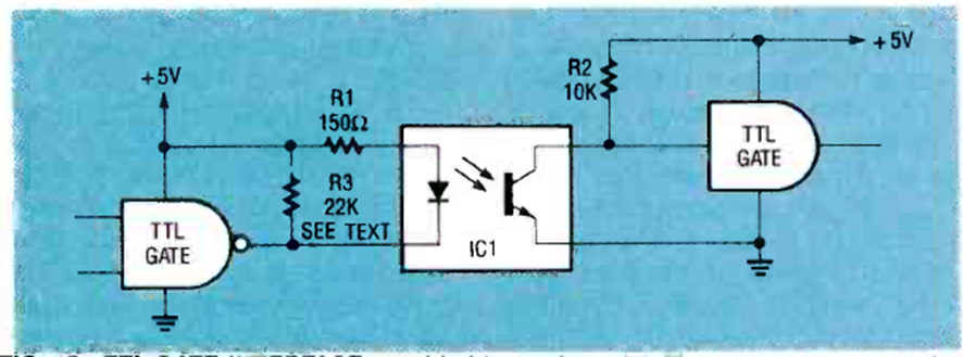 En la figura tenemos la forma de acoplar dos circuitos TTL utilizando un acoplador óptico para obtener aislamiento. El circuito aparece en la revista Radio Electronics de agosto de 1992.