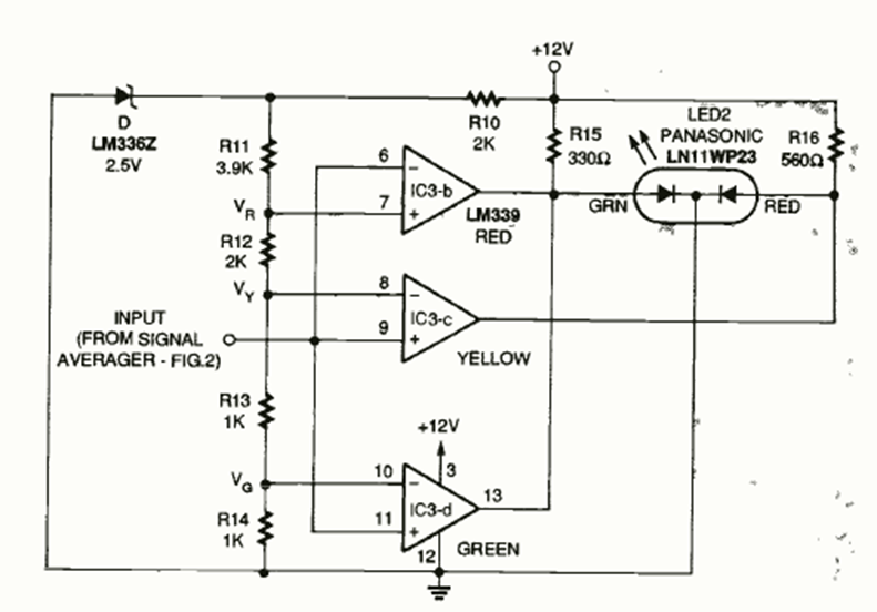 Este circuito de dos LED indica tres niveles de señal. Lo encontramos en la revista Electronics Now de enero de 1996. El circuito integrado podría ser el LM339 u otro comparador.