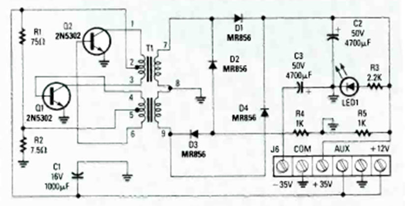 Este circuito para alimentar el proyecto anterior con el LM12 fue publicado en la misma revista. El circuito consta de un inversor de alta potencia. Los transistores deben estar equipados con excelentes disipadores de calor.