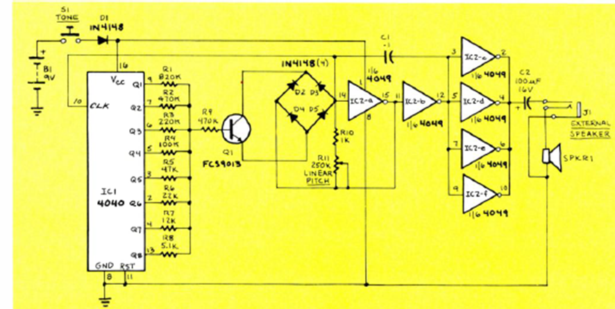 Encontrado en la revista Radio Electronics de junio de 1987, este circuito utiliza componentes CMOS bien conocidos. El circuito tiene una etapa amplificadora CMOS que activa un pequeño altavoz.