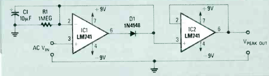 Este circuito con el amplificador operacional LM741 se puede aplicar a otros amplificadores operacionales. Lo encontramos en la revista Radio Electronics de septiembre de 1989.