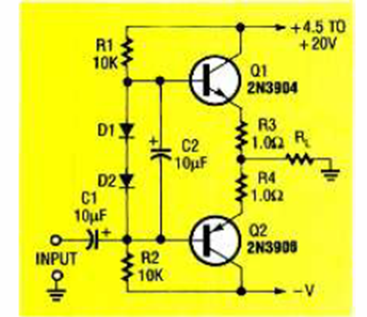 Este circuito de alta impedancia de entrada utiliza una fuente simétrica. Lo encontramos en la revista Electronics Now de octubre de 1993. Se puede utilizar como etapa de potencia.