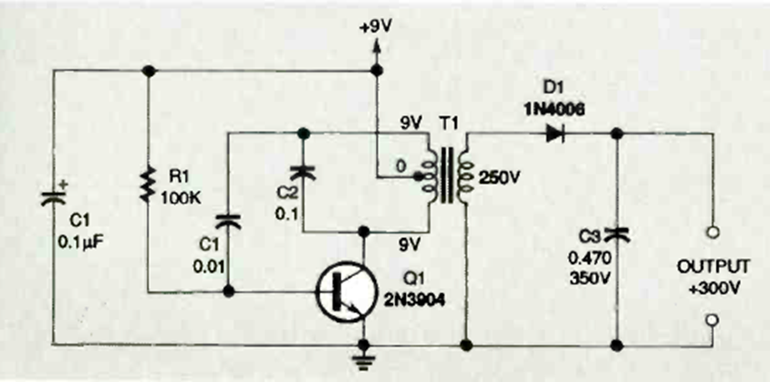 Este inversor de voltaje utiliza un pequeño transformador. El circuito fue encontrado en la edición de abril de 1995 de la revista Electronics Now. La corriente de salida es muy baja.