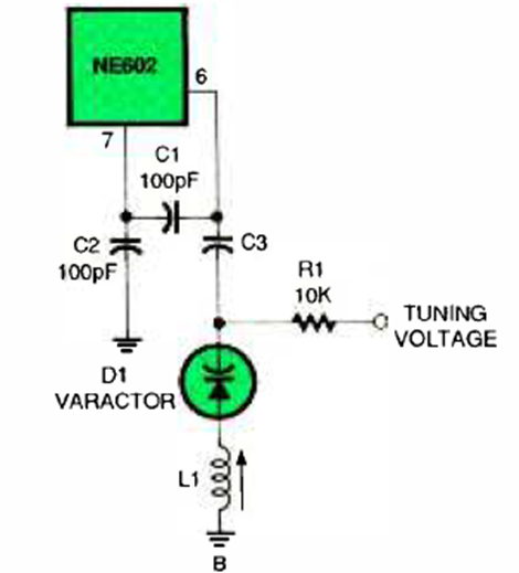 Este circuito varicap es de la revista Electronics Now, febrero de 1997. La frecuencia depende de L1 y de los otros capacitores. El circuito alcanza los 50 MHz.