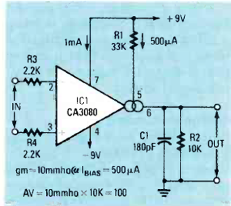 Este amplificador con OTA tiene una ganancia de 40 dB. La fuente de alimentación debe ser simétrica. Lo encontramos en el número de mayo de 1988 de Radio Electronics.