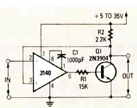 Añadiendo un transistor a la salida y algunas características de polarización podemos obtener una corriente de salida más alta para un dispositivo operativo. En este circuito la corriente es de 50 mA, pero se pueden utilizar otros transistores para corrientes más altas.