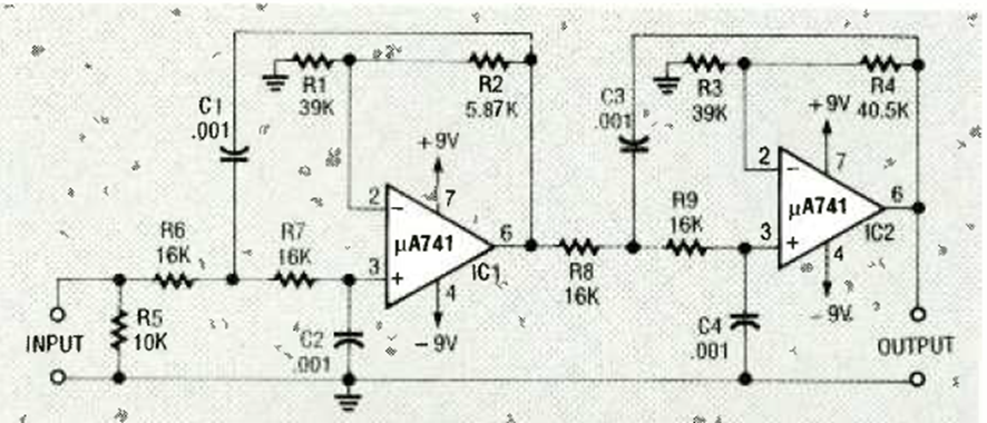 Utilizando dos amplificadores operacionales 741, este circuito de paso bajo tiene una frecuencia de corte de 10 kHz. Lo encontramos en un artículo de la revista Electronics Now de agosto de 1993.