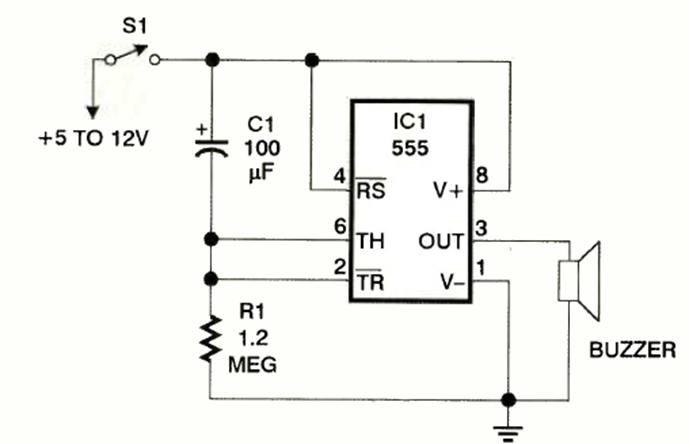 Esta es la configuración básica para accionar un zumbador de cerámica con el 555 que sonará en un intervalo de 2 minutos. Lo encontramos en la revista Electronics Now de noviembre de 1997. El zumbador es de tipo oscilador.