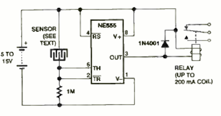 Encontramos este circuito en la revista Electronics Now de mayo de 1996. El relé debe tener una tensión acorde a la alimentación del circuito y una corriente de disparo no mayor a 50 mA.