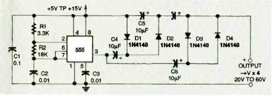 Lartensión de salida de este circuito es aproximadamente cuatro veces la tensión de suministro. El circuito es de una aplicación de Electronics Now de abril de 1995. La corriente de salida es muy baja.