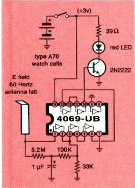 Se pueden utilizar otras puertas CMOS en este sensor que encontramos en la revista Electronic Now de julio de 1995. El circuito capta el zumbido de CA de la red eléctrica u otras fuentes.