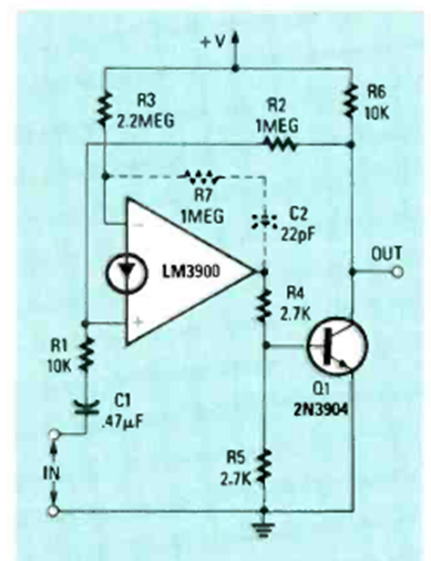 Este circuito se encontró en un artículo de la revista Radio Electronics de diciembre de 1988. El circuito tiene su ganancia y banda de paso amplificadas mediante el uso de un transistor adicional.