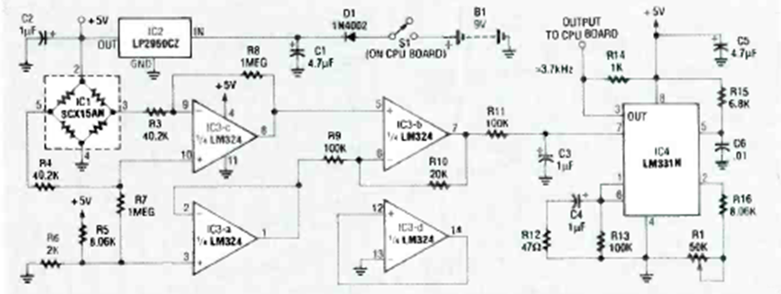 A continuación, se muestra el circuito de conversión del sensor de altura analógico del circuito anterior. También aparece en el artículo de la revista Electronics Experimenter de 1992.