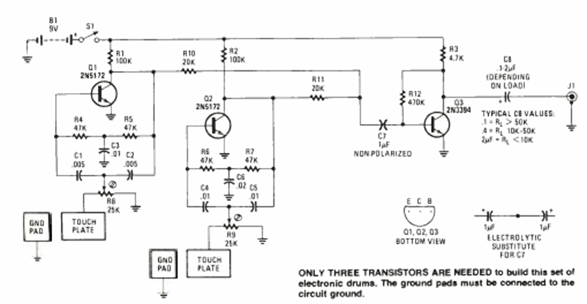 El sonido de una batería se puede conseguir con estos dos osciladores doble T activados por contacto. El circuito es de una Radio Electronics Special Projects de 1993.