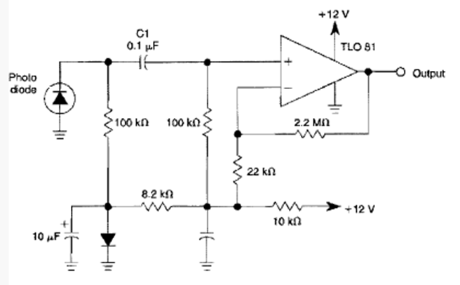 Este circuito de enlace o alarma se encontró en la Enciclopedia de Circuitos Electrónicos, Volumen 5 de 1995. El circuito utiliza un fotodiodo como sensor y su ganancia se obtiene mediante resistencias de retroalimentación negativa.