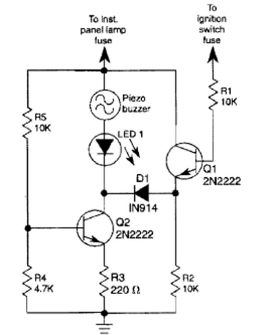 Este circuito, que se encuentra en el Radio Experimenter Handbook (edición de 1986), avisa cuando las luces altas del coche están encendidas y el coche se apaga. El circuito utiliza componentes comunes.