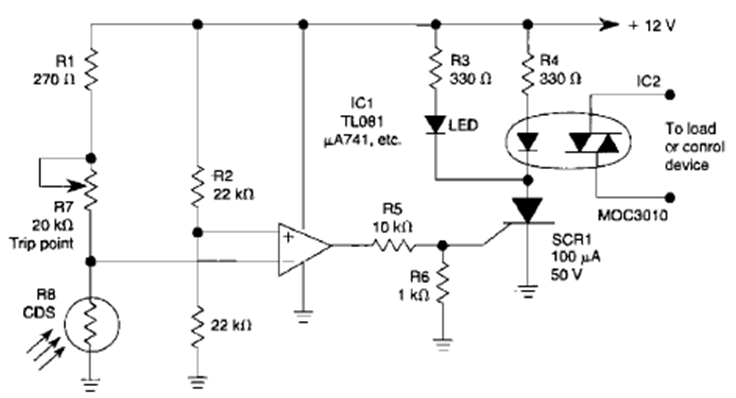 Utilizando un LDR como sensor y un amplificador operacional, este circuito se encontró en la Enciclopedia de Circuitos Electrónicos, volumen 5, de 1995. El circuito activa un optodiac.