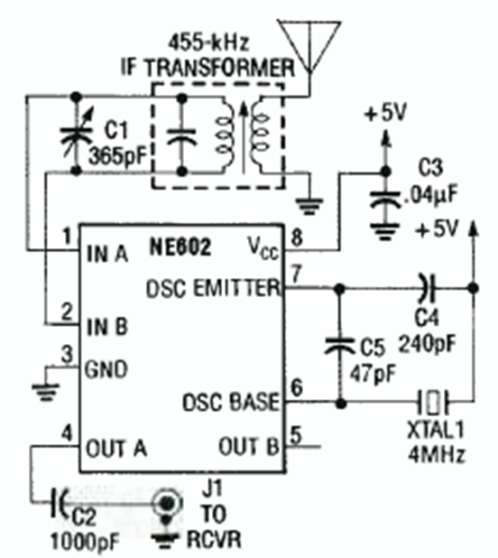 Este circuito convierte señales de la banda de onda larga (VLF) de 350 kHz a 500 kHz a la banda de 4,35 a 4,6 MHz. El circuito es de la edición de 1992 del Electronics Experimenter Handbook.
