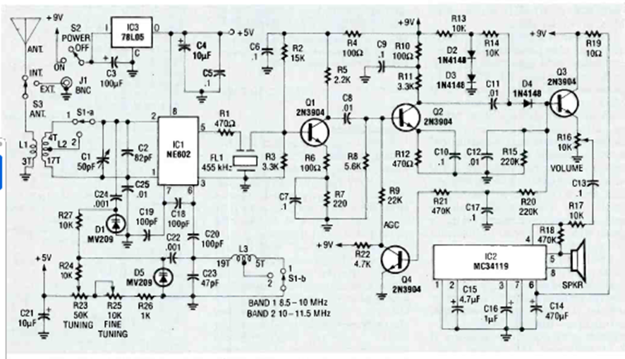 Este receptor cuyo rango de sintonización depende de L1 y L2 fue encontrado en la edición especial de 1992 de Radio Electronics Experimenter. El circuito es relativamente simple y tiene buena sensibilidad.