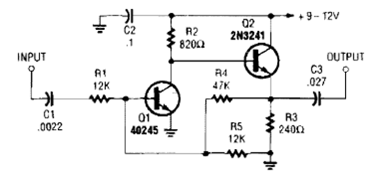 Este circuito se encontró en un producto de Popular Electronics de los años 90. Los transistores son de propósito general y la ganancia depende de la relación entre R2 y R1.